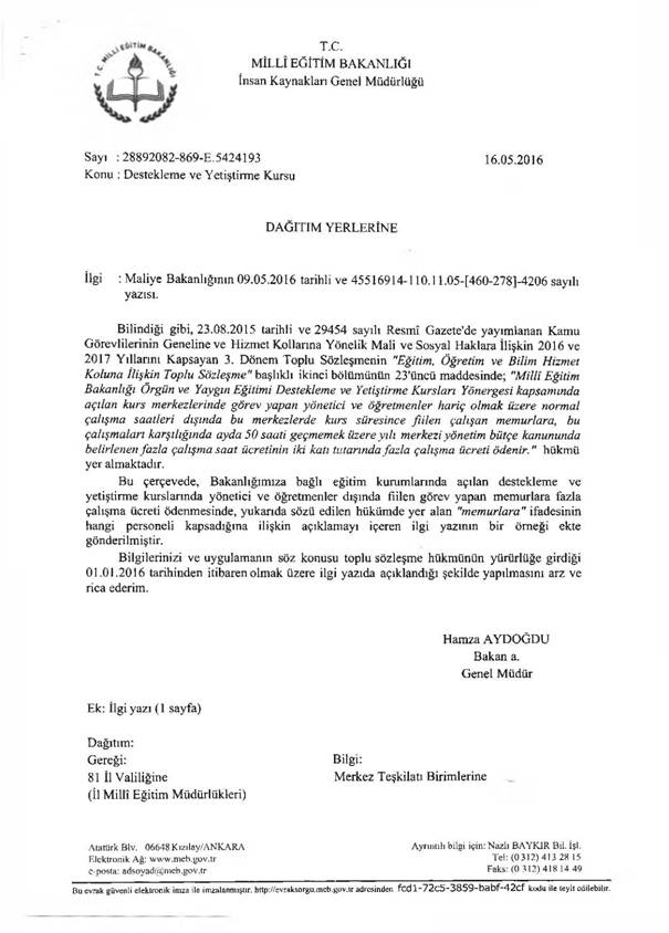 2016-2017 yıllarına yönelik toplu sözleşme metninin Kurs merkezlerinde görev yapan diğer personel başlıklı 23. Maddesi ‘‘Milli Eğitim Bakanlığı ve Yaygın Eğitim Kurumları Destekleme ve Yetiştirme Kursları Yönergesi kapsamında açılan kurs merkezlerinde görev yapan yönetici ve öğretmenler hariç olmak üzere normal çalışma saatleri dışında bu merkezlerde kurs süresince fiilen çalışan memurlara, bu çalışmaları karşılığında ayda 50 saati geçmemek üzere yılı merkezi yönetim bütçe kanunda belirlenen fazla çalışma saat ücretinin iki katı tutarında fazla çalışma ücreti ödenir.’’ şeklindedir.