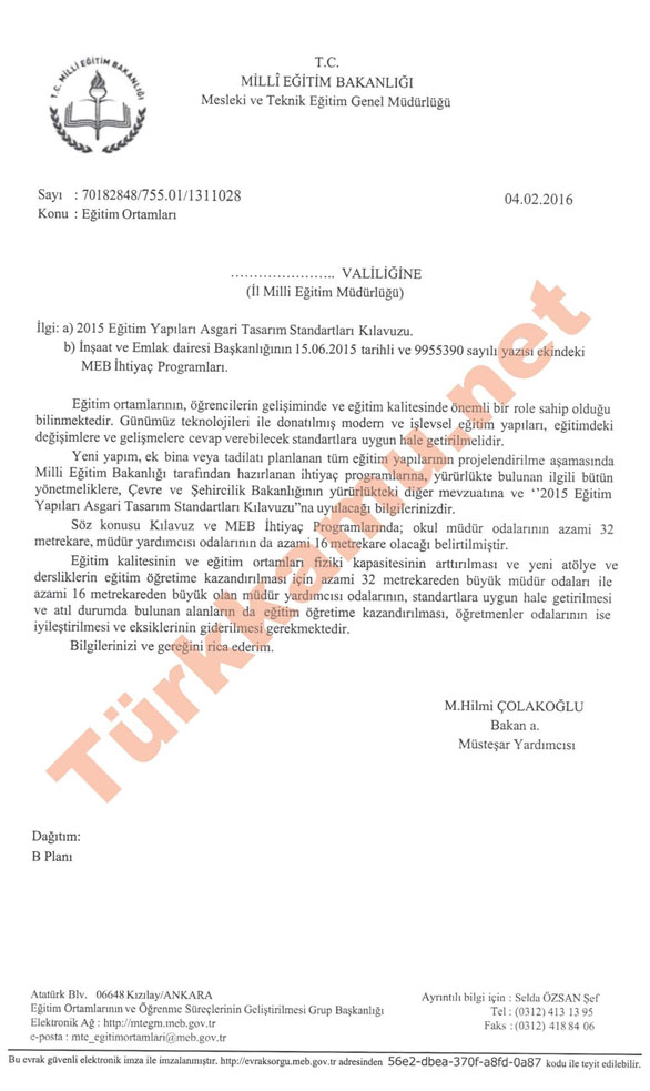 MEB: Eğitim kalitesinin ve eğitim ortamları fiziki kapasitesinin arttırılması ve yeni atölye ve dersliklerin eğitim öğretime kazandırılması için azami 32 metrekareden büyük müdür odaları ile azami 16 metrekareden büyük olan müdür yardımcısı odalannın, standartlara uygun hale getirilmesi ve atıl durumda bulunan alanların da eğitim öğretime kazandırılması, öğretmenler odalarının ise iyileştirilmesi ve eksiklerinin giderilmesini istedi.