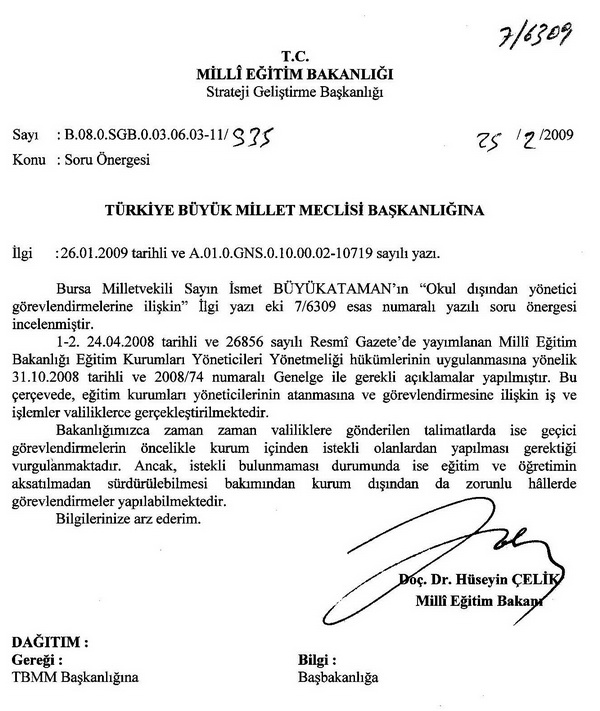 Geçici görevlendirmeler hakkındaki; Bakanlığınızca da bu tür görevlendirmeler bilinmesine rağmen neden yapılmaktadır? Taşra teşkilatlarınız emirlerinize uymamakta mıdır? Bu tür usulsüz görevlendirmelerin iptal edilerek okul içinden yapılmasını isteyen bir genelge yayınlayacak mısınız? Sorularını içeren yazılı bir soru önergesine Milli Eğitim Bakanlığı Bakanlığımızca zaman zaman valiliklere gönderilen talimatlarda ise geçici görevlendirmelerin öncelikle kurum içinden istekli olanlardan yapılması gerektiği vurgulanmaktadır. Ancak, istekli bulunmaması durumunda ise eğitim ve öğretimin aksatılmadan sürdürülebilmesi bakımından kurum dışından da zorunlu hallerde görevlendirmeler yapılabilmektedir. açıklamasında bulunmuştur.