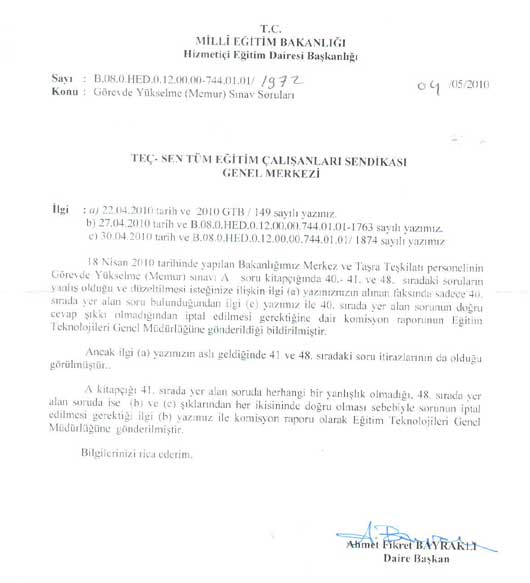 18.04.2010 tarihli MEB Merkez ve Taşra Teşkilatı Personeline Yönelik Görevde Yükselme Sınavında A kitapçığının 40., 41. ve 48. sorularının hatalı olduğu iddiasıyla sendikalar tarafında yapılan itirazları değerlendirdi.