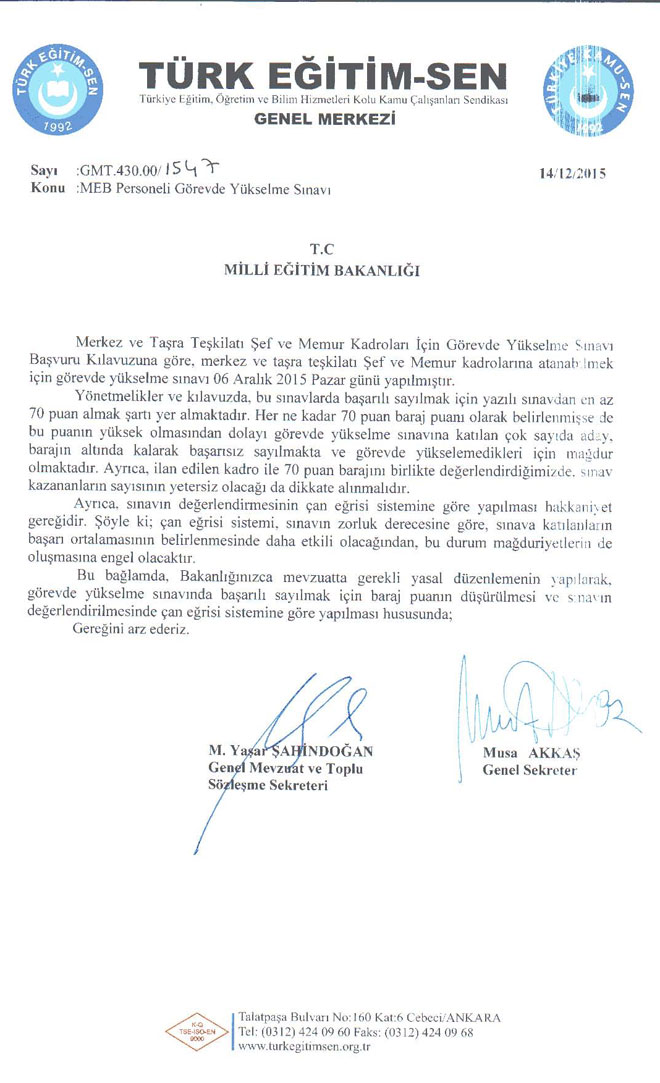 Türk Eğitim-Sen olarak Bakanlığa gönderdiğimiz yazıda, mevzuatta gerekli yasal düzenlemenin yapılarak, görevde yükselme sınavında başarılı sayılmak için baraj puanın düşürülmesi ve sınavın değerlendirilmesinin çan eğrisi sistemine göre yapılması hususunda talepte bulunduk.
