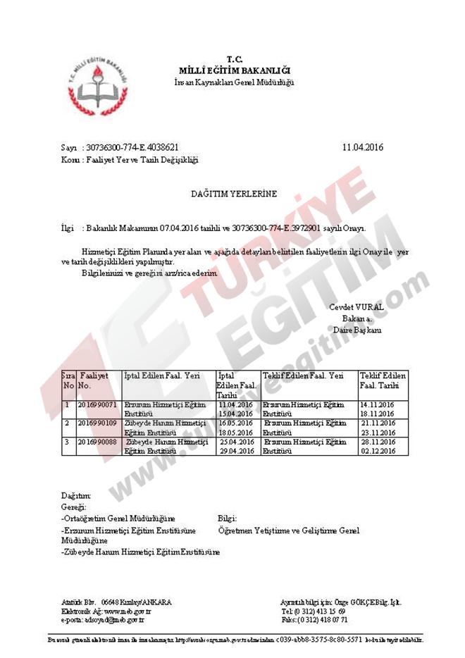 MEB Hizmetiçi Faaliyet Yer ve Tarih Değişikliği