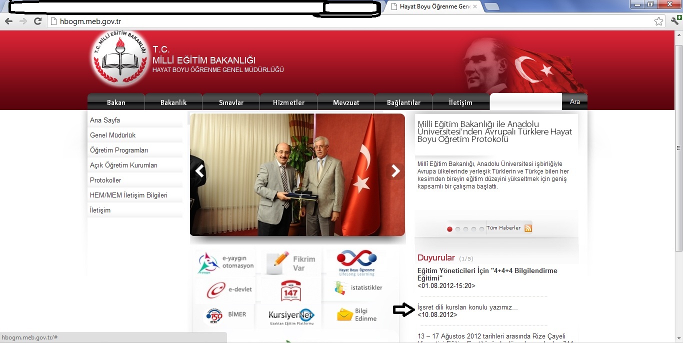 1-Hayat Boyu Öğrenme Genel Müdürlüğü sayfası, duyurular bölümü: