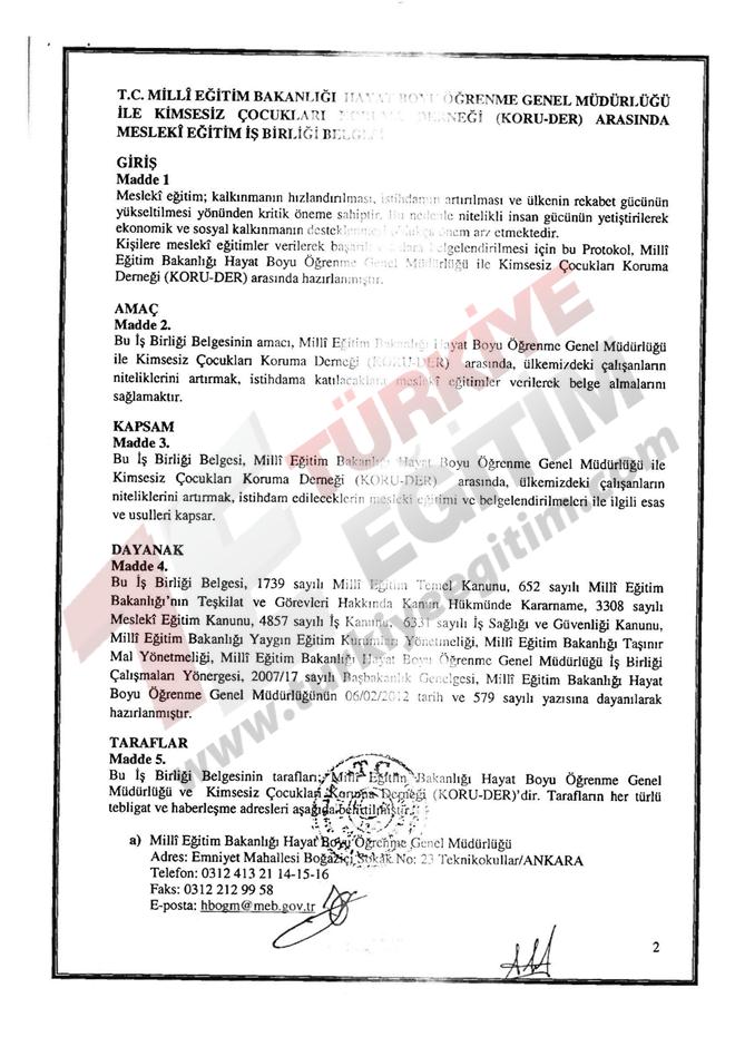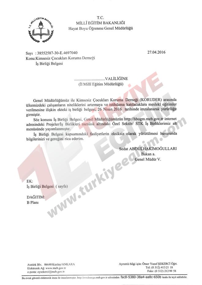 Genel Müdürlüğümüz ile Kimsesiz Çocukları Koruma Demeği (KORUDER) arasında ülkemizdeki çalışanların niteliklerini artırmaya ve istihdama katılacaklara meslekî eğitimler verilmesine ilişkin ekteki iş birliği belgesi, 26 Nisan 2016 tarihinde imzalanarak yür