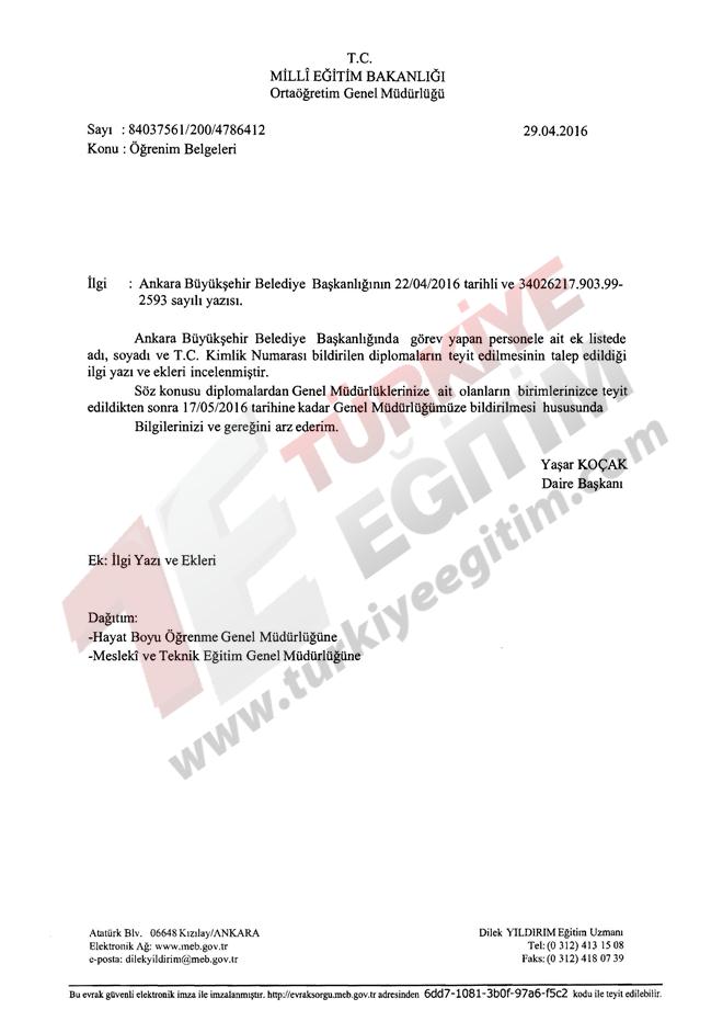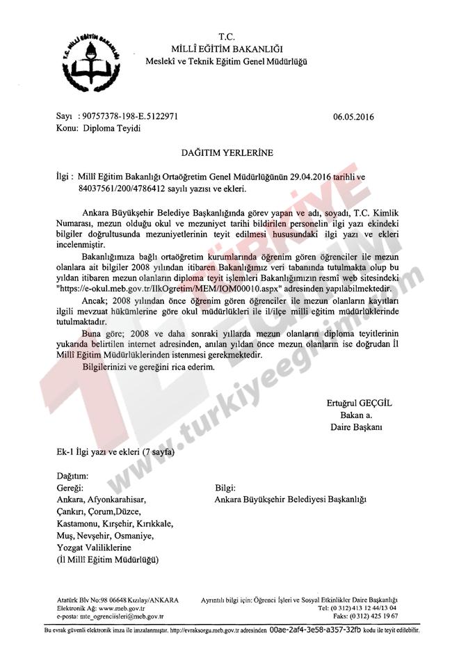 MÎLLÎ EĞİTİM BAKANLIĞI Mesleki ve Teknik Eğitim Genel Müdürlüğü'nden Diploma Teyidi yazısı: