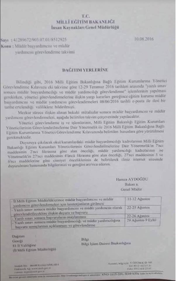 MEB, 15 Temmuz'da, Danıştay'ın ilgili yönetmelikteki müdür yardımcılığı yazılı sınav konularına ilişkin hükümlerinin yürütmesini durdurma kararının ardından yeni bir takvim belirlemiş ve bu takvimi illere bildirmişti.