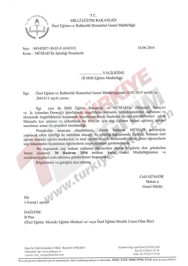 İlgi yazı ile Milli Eğitim Bakanlığı ve MÜSİAD'm (Müstakil Sanayici ve İş Adamları Derneği) işbirliğinde, engellilerin toplumla bütünleşmelerini sağlaması ve ekonomik özgürlüklerini kazanarak hayatlarım kendi başlarına devam ettirebilmeleri adına Müsiad'a üye işletme ve şirketlerde bu bireyler için staj (işletme beceri eğitimi) imkanı sunulması amacı ile protokol imzalandığı,