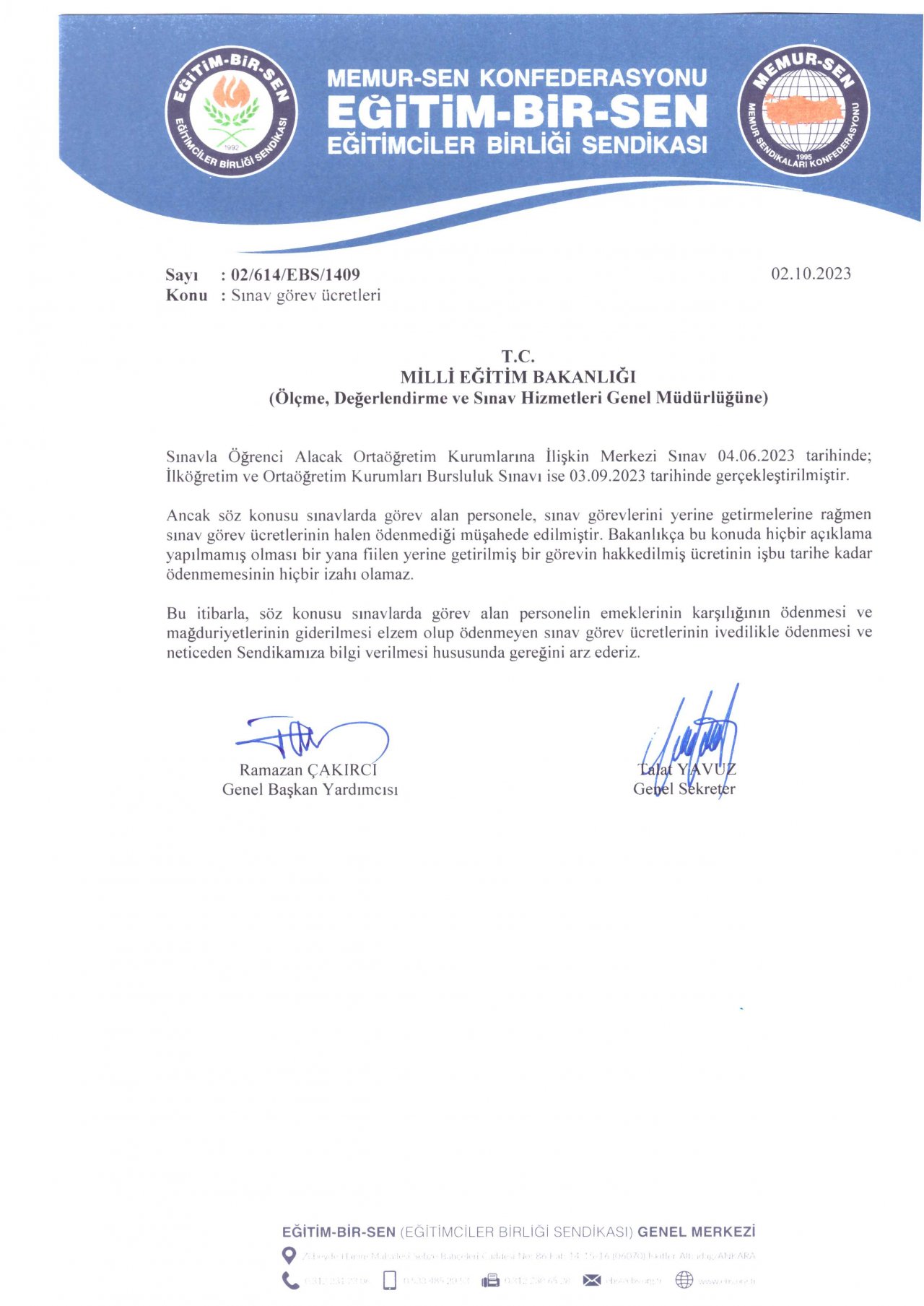 Eğitim-Bir-Sen olarak Millî Eğitim Bakanlığı’na başvurarak, bakanlık tarafından gerçekleştirilen LGS ve bursluluk sınavlarında görev alan eğitim çalışanlarının sınav görev ücretlerinin ödenmesini istedik.