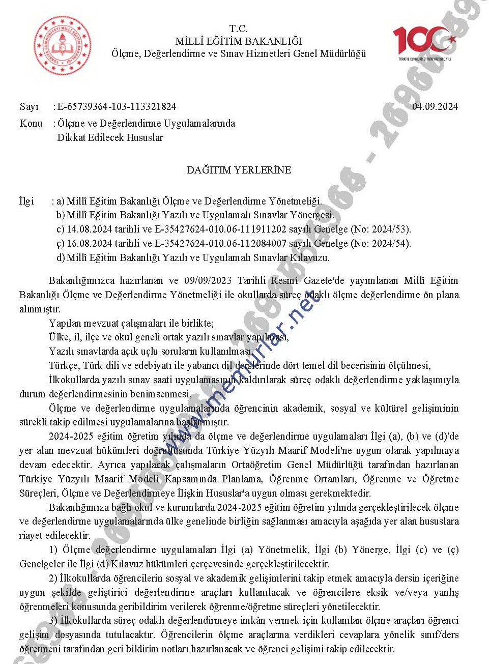 Milli Eğitim Bakanlığı Ölçme, Değerlendirme ve Sınav Hizmetleri Genel Müdürlüğü 04.09.2024 tarih ve 113321824 sayılı yazılarıyla "Ölçme ve Değerlendirme Uygulamalarında Dikkat Edilecek Hususlar"ı açıklamıştı 2024-2025- eğitim öğretim yılına sonu...