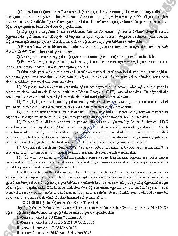 Bakanlığımıza bağlı okul ve kurumlarda 2024-2025 eğitim öğretim yılında gerçekleştirilecek ölçme ve değerlendirme uygulamalarında ülke genelinde birliğin sağlanması amacıyla aşağıda yer alan hususlara riayet edilecektir.