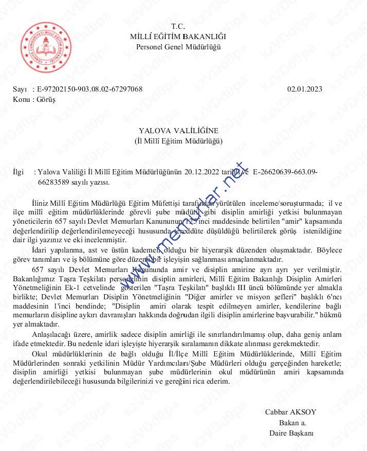 Milli Eğitim Bakanlığı Personel Genel Müdürlüğü, 2 Ocak 2023 tarihli ve 67297068 sayılı yazısında, şu ifadeye yer vermiştir: