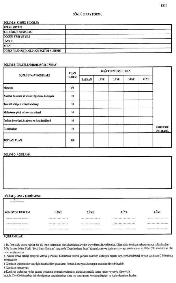 (2) Müdürlük için yapılacak sözlü sınava katılmaya hak kazanan adaylar, 21 inci maddede belirtilen sözlü sınav konuları ve ağırlıkları dikkate alınarak Ek-2’de yer alan form üzerinden sözlü sınav komisyonunca yüz tam puan üzerinden değerlendirilir.