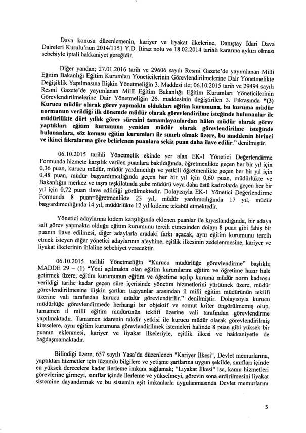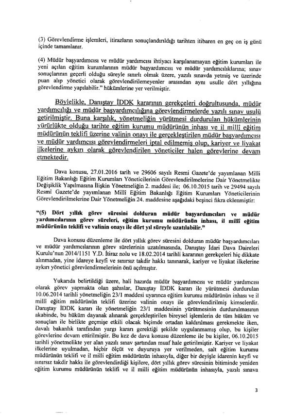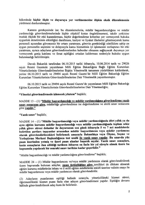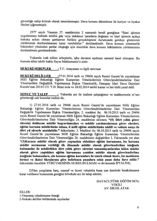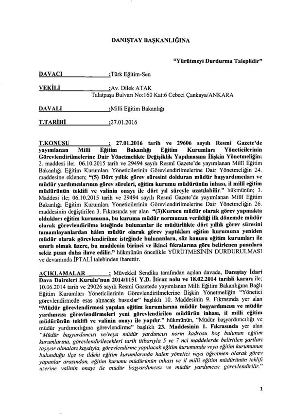 Türk Eğitim Sen olarak, 27.01.2016 tarih ve 29606 sayılı Resmi Gazete’de yayımlanan Milli Eğitim Bakanlığı Eğitim Kurumları Yöneticilerinin Görevlendirilmelerine Dair Yönetmelikte Değişiklik Yapılmasına İlişkin Yönetmeliğin; 2. maddesi ile; 06.10.2015 tarih ve 29494 sayılı Resmî Gazete’de yayımlanan Millî Eğitim Bakanlığı Eğitim Kurumları Yöneticilerinin Görevlendirilmelerine Dair Yönetmeliğin 24. maddesine eklenen 5. Fıkranın ve aynı yönetmeliğin 26. maddesinin değiştirilen 3. Fıkrasının iptali istemiyle Danıştay nezdinde dava açmış bulunmaktayız.