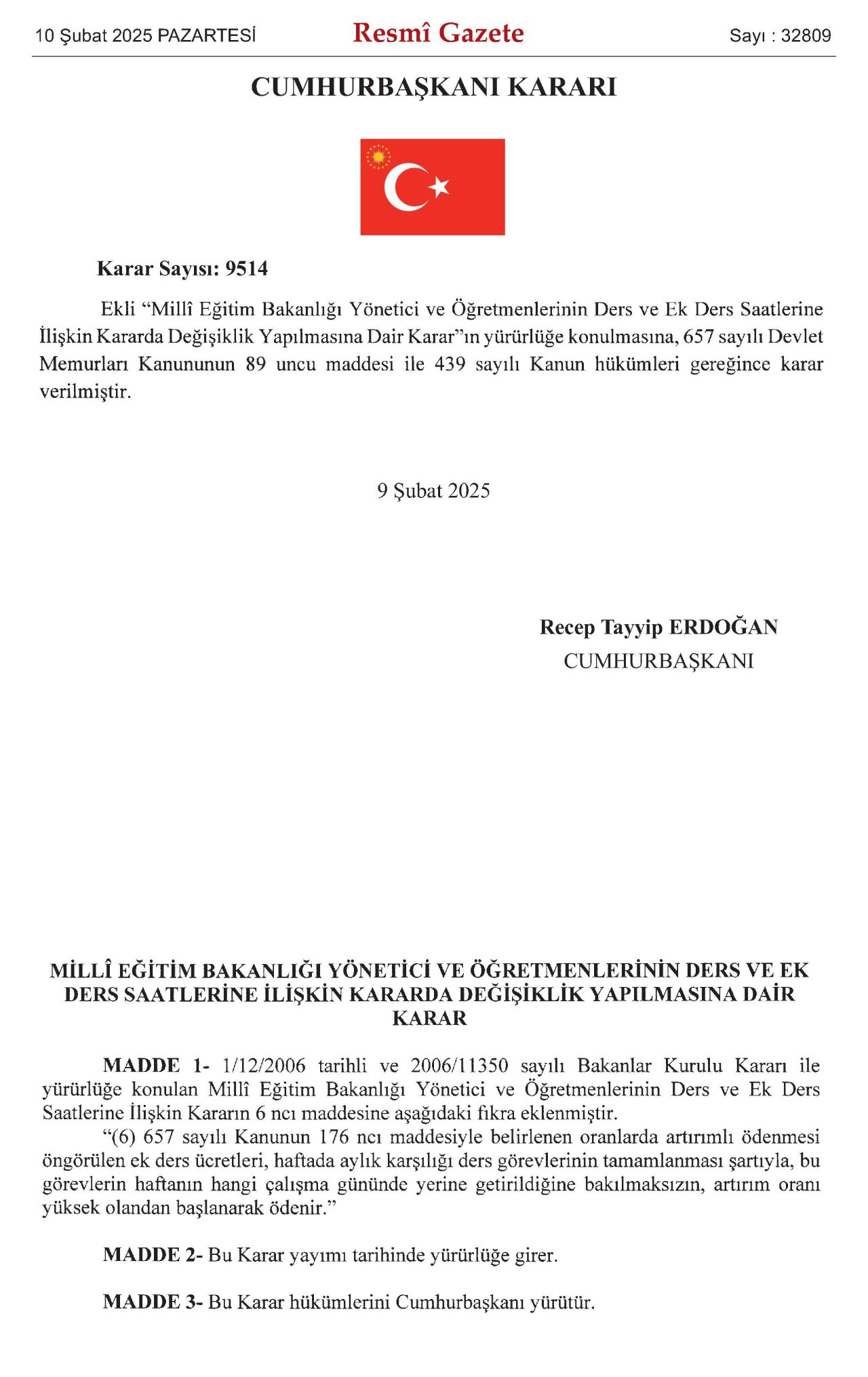 Millî Eğitim Bakanlığı Yönetici ve Öğretmenlerinin Ders ve Ek Ders Saatlerine İlişkin Kararda Değişiklik Yapılmasına Dair Karar (Karar Sayısı: 9514)