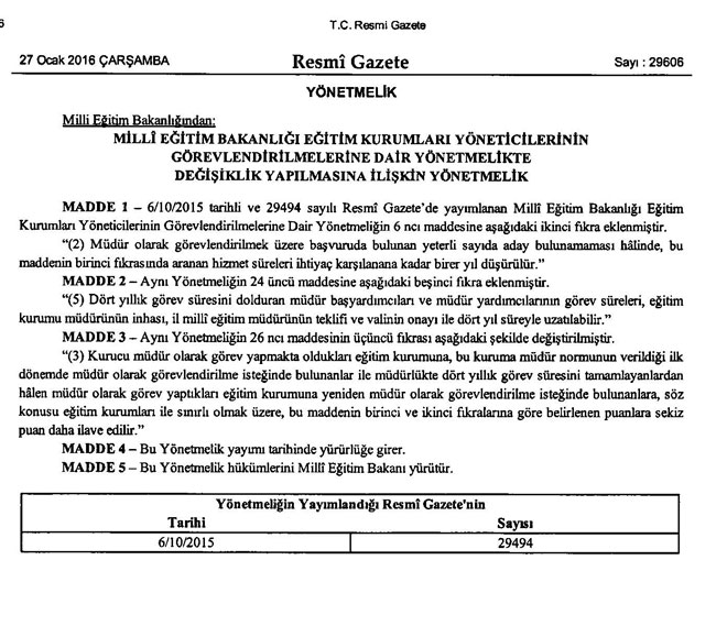 27.01.2016 tarih ve 29606 sayılı Resmi Gazete’de yayımlanan Milli Eğitim Bakanlığı Eğitim Kurumları Yöneticilerinin Görevlendirilmelerine Dair Yönetmelikte Değişiklik Yapılmasına İlişkin Yönetmelik ile 06.10.2015 tarih ve 29494 sayılı Resmî Gazete’de yayımlanan Millî Eğitim Bakanlığı Eğitim Kurumları Yöneticilerinin Görevlendirilmelerine Dair Yönetmeliğin 6., 24. ve 26. Maddelerinde değişiklik yapılmıştır.