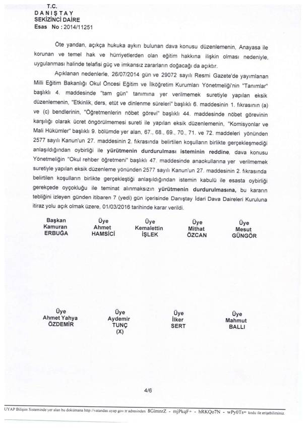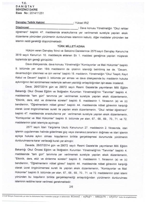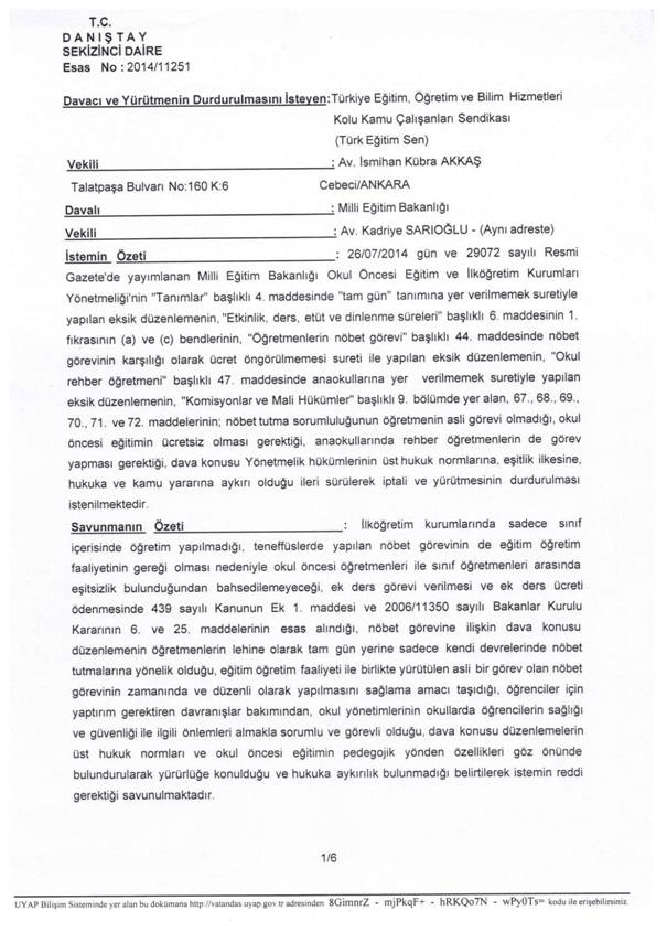 Türk Eğitim-Sen olarak, 26.07.2014 gün ve 29072 sayılı Resmi Gazete’de yayımlanan Milli Eğitim Bakanlığı Okul Öncesi Eğitim ve İlköğretim Kurumları Yönetmeliği’nin “Tanımlar” başlıklı 4. Maddesinde “tam gün” tanımına yer verilmemek suretiyle yapılan eksik düzenlemenin, “Etkinlik, ders, etüt ve dinlenme süreleri” başlıklı 6. Maddesinin 1. Fıkrasının (a) ve (c) bentlerinin, “Öğretmenlerin nöbet görevi” başlıklı 44. Maddesinde nöbet görevinin karşılığı olarak ücret öngörülmemesi sureti ile yapılan eksik düzenlemenin, “Okul rehber öğretmeni” başlıklı 47. Maddesinde anaokullarına yer verilmemek suretiyle yapılan eksik düzenlemenin, “Komisyonlar ve Mali Hükümler” başlıklı 9. Bölümde yer alan, 67., 68., 69.,70.,71. ve 72. Maddelerinin; nöbet tutma sorumluluğunun öğretmenin asli görevi olmadığı, okul eğitiminin ücretsiz olması gerektiği, dava konusu Yönetmelik hükümlerinin üst hukuk normlarına, eşitlik ilkesine, hukuka ve kamu yararına aykırı olduğu ileri sürülerek yürütmesinin durdurulması ve iptali talebiyle açtığımız davada;