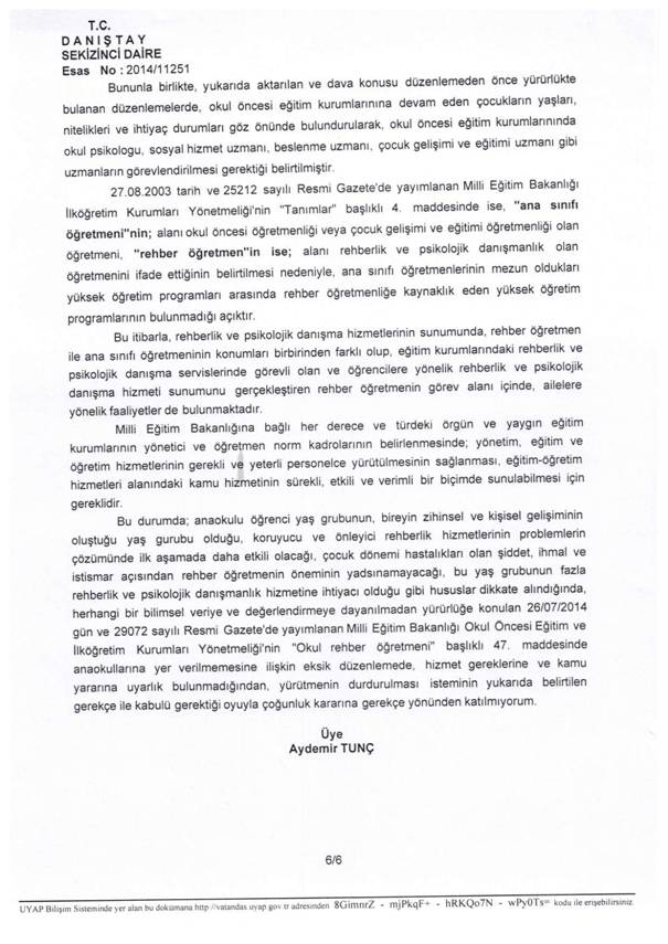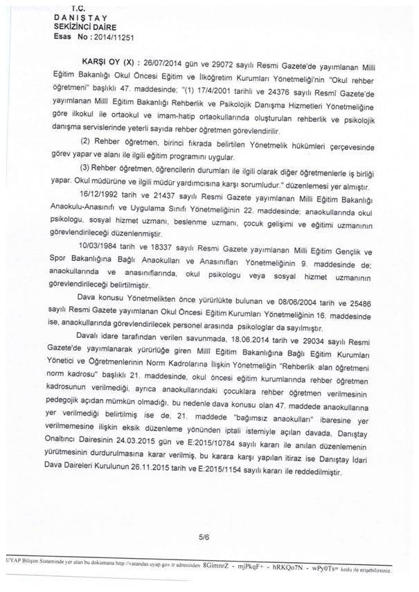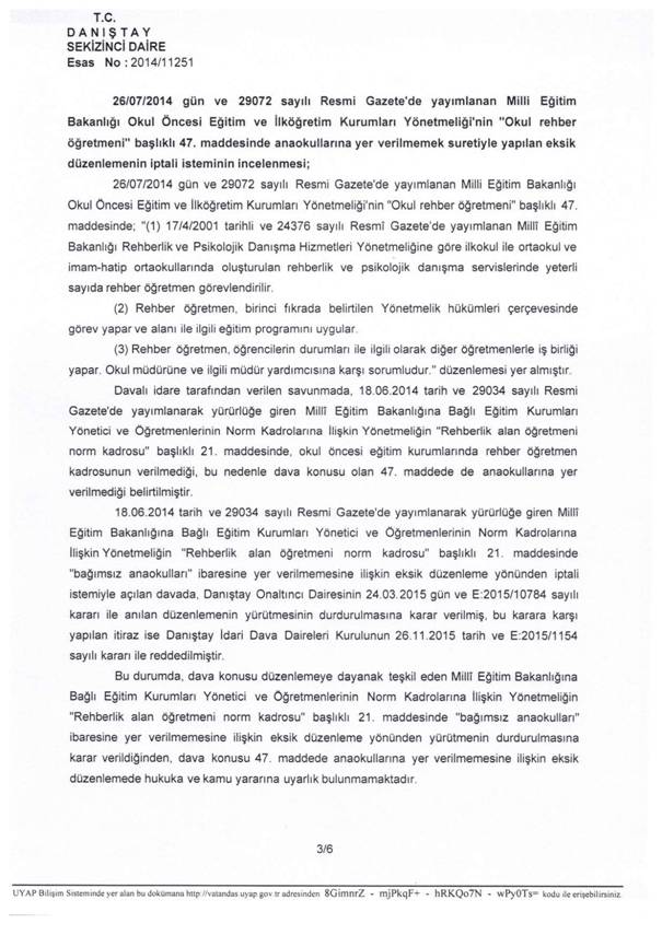 Danıştay 8. Dairesinin 2014/11251 E. ve 01.03.2016 tarihli kararı ile dava konusu düzenlemeye dayanak teşkil eden Milli Eğitim Bakanlığına Bağlı Eğitim Kurumları Yönetici ve Öğretmenlerinin Norm Kadrolarına İlişkin Yönetmeliğin “Rehberlik alan öğretmeni norm kadrosu” başlıklı 21. Maddesinde “bağımsız anaokulları” ibaresine yer verilmemesine ilişkin eksik düzenleme yönünden yürütmenin durdurulmasına karar verildiğinden, dava konusu 47. Maddede anaokullarına yer verilmemesine ilişkin eksik düzenlemede hukuka ve kamu yararına uyarlık bulunmadığı belirtilerek, dava konusu Yönetmeliğin “Okul rehber öğretmeni” başlıklı 47. Maddesinde anaokullarına yer verilmemek suretiyle yapılan eksik düzenleme yönünden yürütmenin durdurulmasına karar verilmiştir.