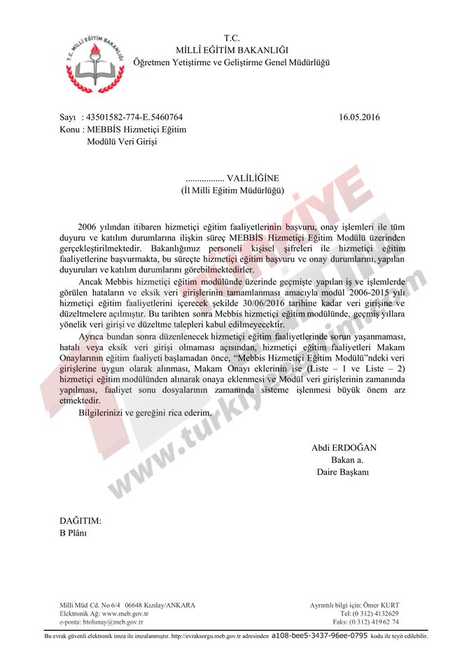 Ancak Mebbis hizmetiçi eğitim modülünde üzerinde geçmişte yapılan iş ve işlemlerde görülen hataların ve eksik veri girişlerinin tamamlanması amacıyla modül 2006-2015 yılı hizmetiçi eğitim faaliyetlerini içerecek şekilde 30/06/2016 tarihine kadar veri girişine ve düzeltmelere açılmıştır. Bu tarihten sonra Mebbis hizmetiçi eğitim modülünde, geçmiş yıllara yönelik veri girişi ve düzeltme talepleri kabul edilmeyecektir.