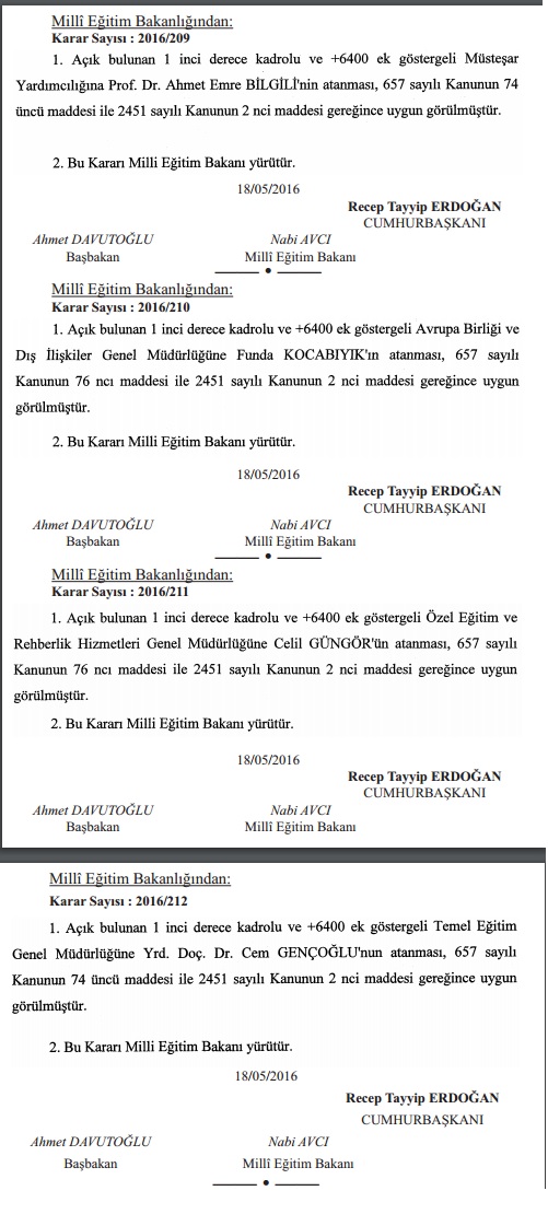 Bugünkü Resmi Gazete'de yayınlanan atama kararlarına göre MEB'de 1 müsteşar yardımcısı ve 3 Genel Müdür ataması yapıldı