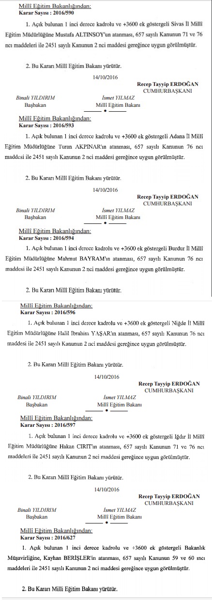 Kararnamelere göre İl Milli Eğitim Müdürü ataması yapılan iller şöyle: