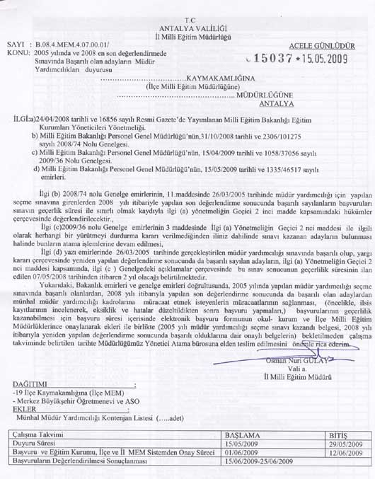 Buna göre; 26.03.2005 tarihinde düzenlenen Müdür Yardımcılığı Seçme Sınavı 07.05.2008 tarihinde Yeniden Değerlendirme sonucunda tekrar açıklanmıştır.