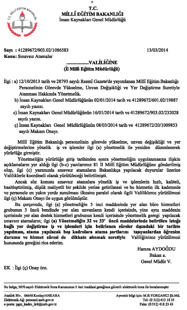 12/10/2013 tarih ve 28793 sayılı Resmi Gazete'de yayımlanan "Milli Eğitim Bakanlığı Personelinin Görevde Yükselme, Unvan Değişikliği, ve Yer Değiştirme Suretiyle Atanması Hakkında Yönetmeliğin "Hizmet Grupları Arasında Geçişler" başlıklı 22' inci maddesinin 1/a fıkrasında "aynı hizmet grubunun alt görev grubunun içinde yer alan aynı düzeydeki görevlerden bu görev grubu içindeki üst bentlerde yer alan görevlere sınavla; aynı veya daha alt bentlerde sayılan görevlere ise bu görev için aranan şartları taşımak kaydıyla sınavsız atama yapılabilir." hükmü bulunmaktadır.