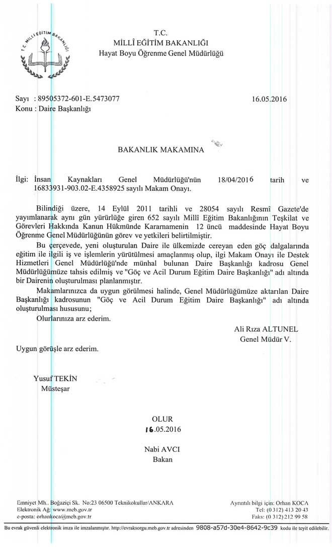 "Hayat Boyu Öğrenme Genel Müdürlüğü" bünyesinde "Göç ve Acil Durum Eğitim Daire Başkanlığı" adı altında bir daire oluşturulmuş. Bu çerçevede, yeni oluşturulan Daire ile ülkemizde cereyan eden göç dalgalarında eğitim ile ilgili iş ve işlemlerin yürütülmesi amaçlanmıştır.