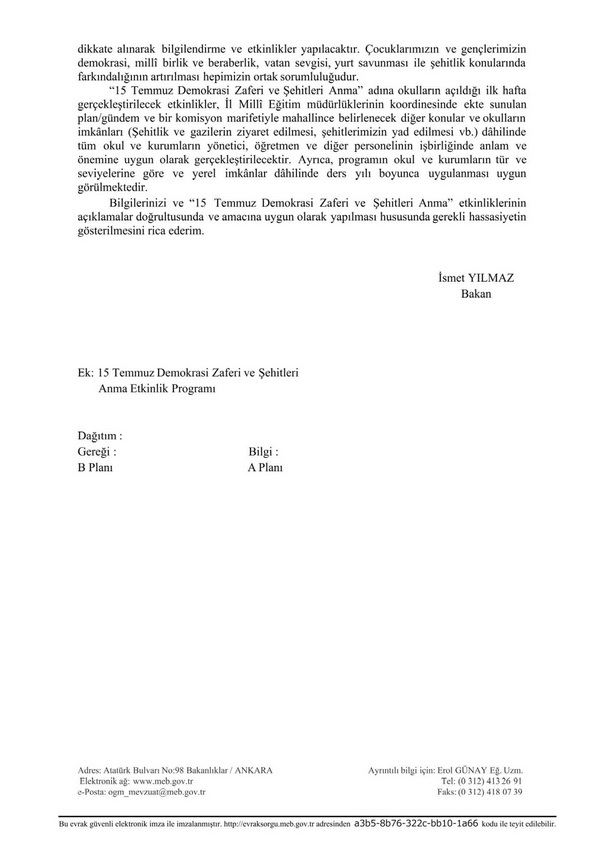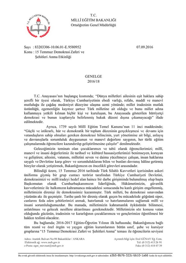 15 Temmuz Demokrasi Zaferi ve Şehitleri Anma Etkinliği Hakkında Genelge 2016/18