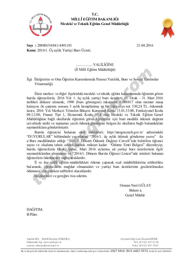 MEB'den 2016 1. Üç Aylık Yurtiçi Burs Ücreti Açıklaması - MEB Mesleki ve Teknik Eğitim Genel Müdürlüğü tarafından Valiliklere gönderilen burs ücreti ödemeleri yazısı