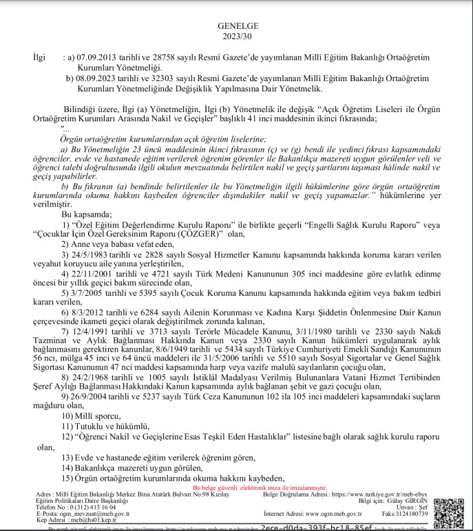 Milli Eğitim Bakanlığı Örgün OrtaÖğretim Kurumlarından Açık Öğretim Liselerine Geçişlere ilişkin genelge yayınladı.
