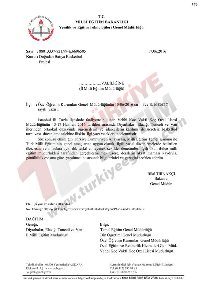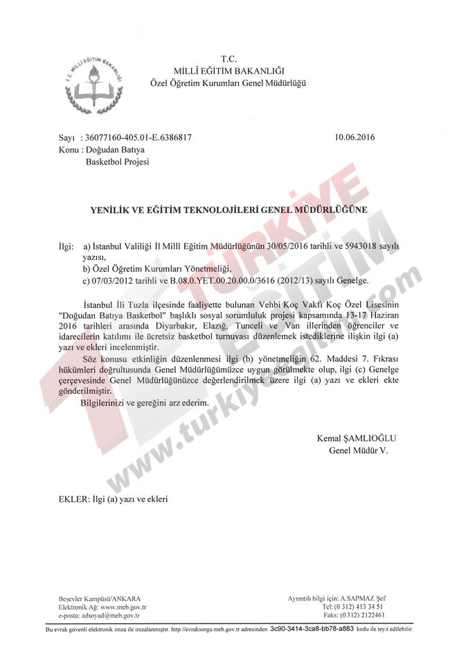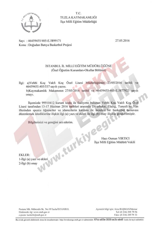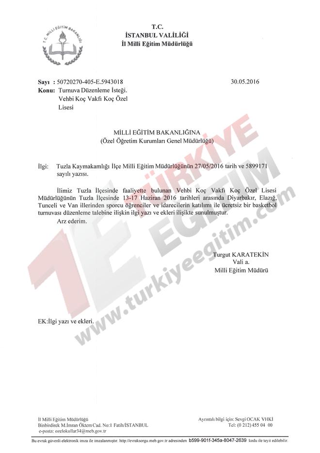 İstanbul ili Tuzla ilçesinde faaliyette bulunan Vehbi Koç Vakfı Koç Özel Lisesi Müdürlüğünün 13-17 Haziran 2016 tarihleri arasında Diyarbakır, Elazığ, Tunceli ve Van illerinden ortaokul düzeyinde öğrencilerin ve idarecilerin katılımı ile ücretsiz basketbol turnuvası düzenleme talebine ilişkin ilgi yazı ve ekleri incelenmiştir.
