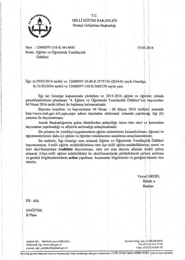 MEB'den Eğitim ve Öğretimde Yenilikçilik Ödülleri Yazısı - MEB Duyurusu