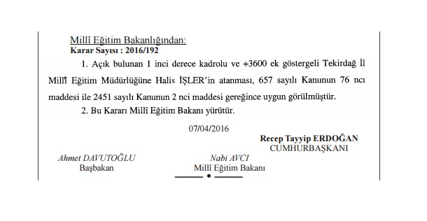 MEB, bugünkü Resmi Gazete'de yayınlanan kararname ile Tekirdağ il müdürlüğüne Halis İŞLER'in atamasını yaptı.
