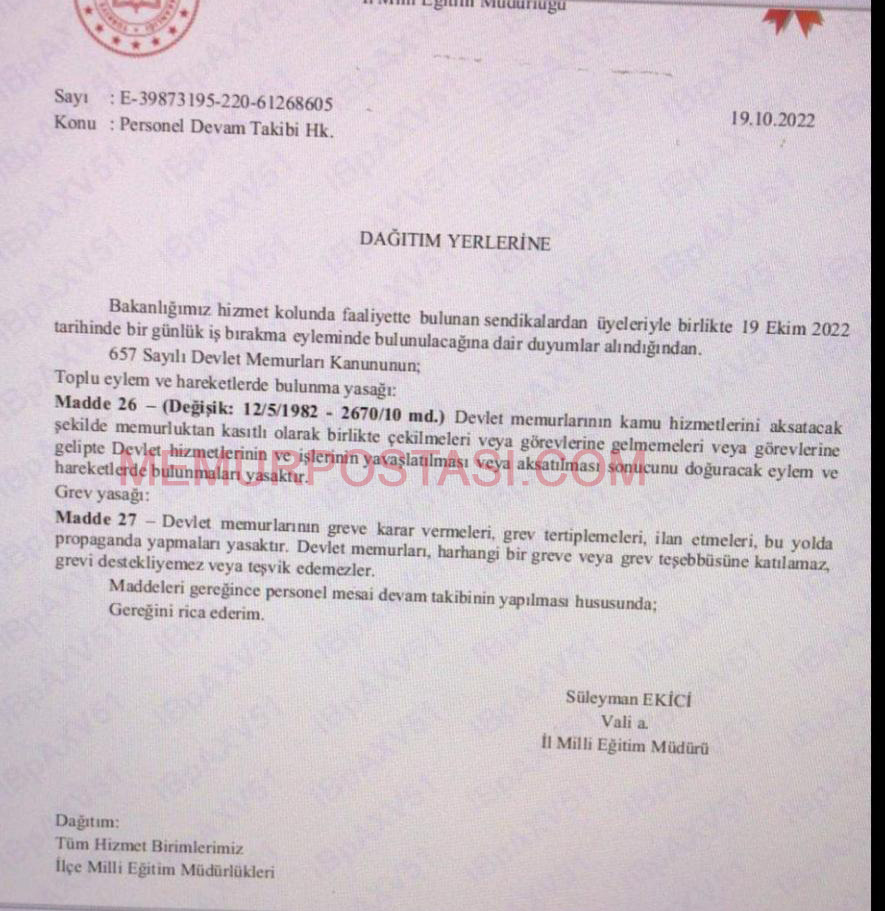 İl Milli Eğitim'den gönderilen resmi yazıda; 657 sayılı devlet memurları kanununun ilgili maddeleri işaret edilerek personelin devam takibinin yapılması istendi. Bu adımla anlıyoruz ki MEB, iş bırakma eylemine katılacak olan öğretmenler hakkında disiplin işlemi yapacak.