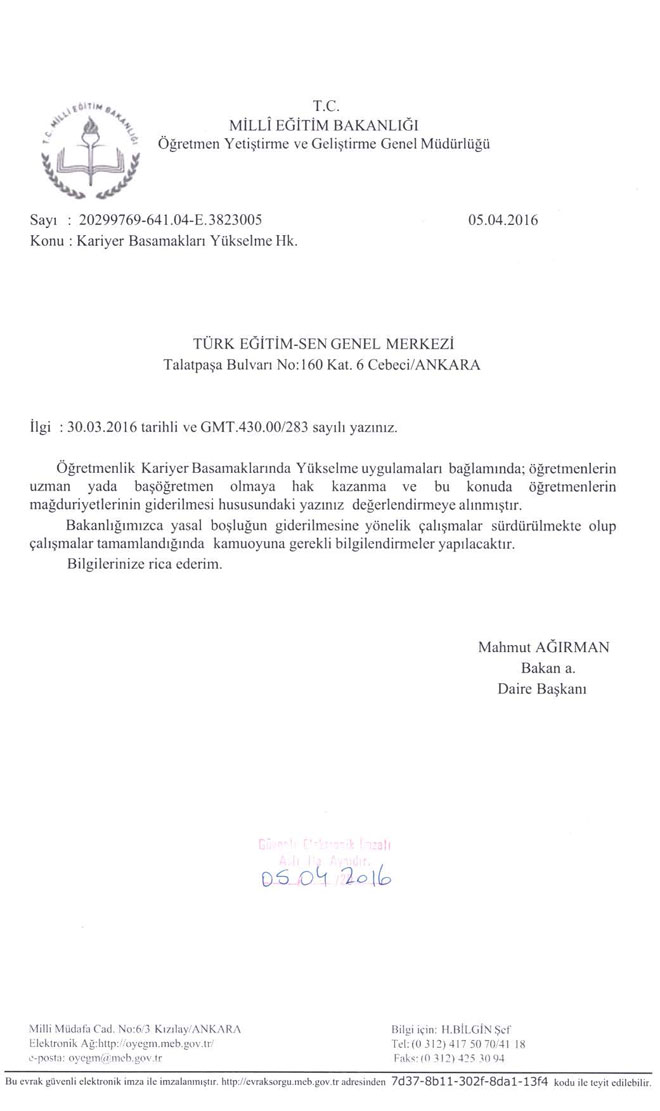 Türk Eğitim-Sen, Bakanlığa gönderdiği yazıda, Anayasa Mahkemesi kararından sonra oluşan yasal boşluğun ivedilikle giderilmesi hususunda çalışma başlatılmasını, sınavsız olarak 10 yılını dolduran öğretmenlere uzman öğretmen, 20 yılını dolduran öğretmenlere ise başöğretmen unvanının verilmesi için gerekli yasal düzenlemelerin yapılmasının sağlanmasını talep etmişti.