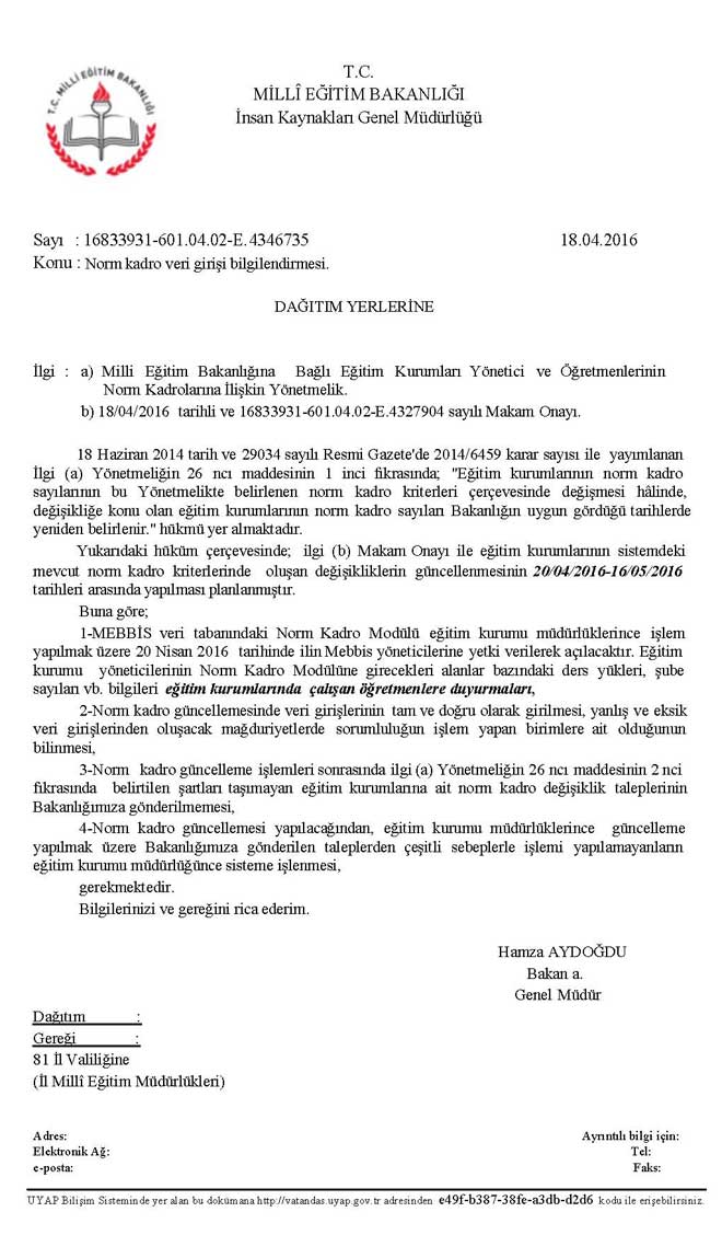 Milli Eğitim Bakanlığı tarafından il milli eğitim müdürlüklerine gönderilen yazıda; Eğitim kurumlarının norm kadroları 20/04/2016 - 16/05/2016 tarihlerinde güncellemeleri talimatı verildi.