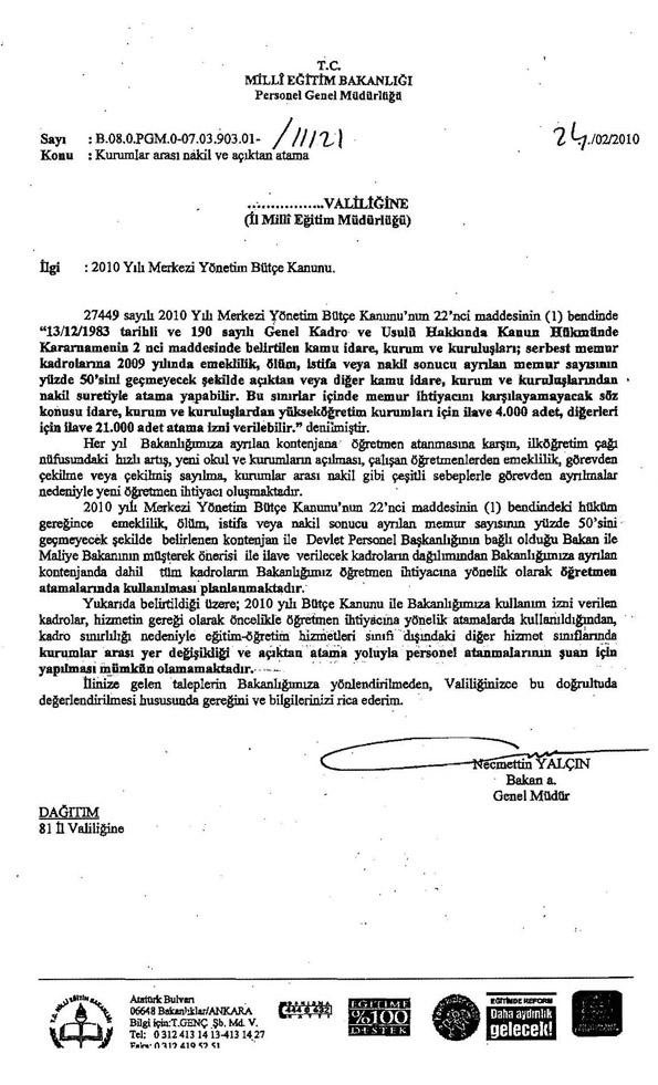 Milli Eğitim Bakanlığı Personel Genel Müdürlüğü 24/02/2010 tarih ve 11121 sayılı yazılarında;