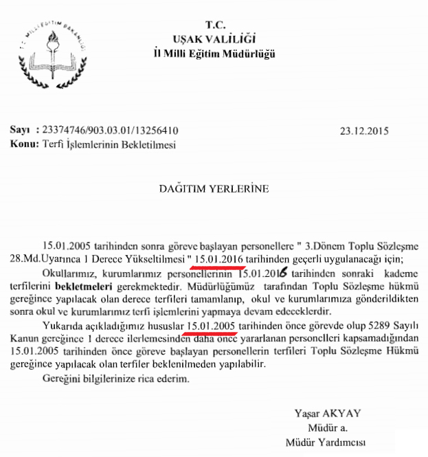 Devlet memuriyetine 15 Ocak 2005 tarihinden önce başlamış olanlar hakkında ilave 1 derece yükselmesi uygulanmış, ancak bu tarih ve sonrasında göreve başlayanlar için böyle bir imkan verilmemişti. Toplu sözleşmedeki metin aşağıdaki gibidir: "Madde 28 -(1) 457 sayılı Kanun Hükmünde Kararnameyle 399 sayılı Kanun HükmündeKararnameye eklenen ek geçici madde, 458 sayılı Kanun Hükmünde Kararnameyle 657 sayılı Devlet Memurları Kanununa eklenen mülga ek geçici madde ve 459 sayılı Kanun Hükmünde Kararnameyle 926 sayılı Türk Silahlı Kuvvetleri Personel Kanununa eklenen ek geçici madde hükümleri; anılan ek geçici maddeler kapsamında belirtilen (sözleşmeli subay, sözleşmeli astsubay, uzman jandarma ve uzman erbaşlar dahil) ve bu ek geçici maddeler ile 2/2/2005 tarihli ve 5289 sayılı Kanun hükümlerinden yararlanmamış olanlardan 15/1/2016 tarihinde görevde bulunanlar (aylıksız izinde bulunanlar dahil) ile bunlardan anılan tarihten önce emekli, adi malüllük, vazife malullüğü aylığı bağlananlar ile dul ve yetim aylığı alanlar hakkında da uygulanır." 2015 toplu sözleşmede 15 ocak 2005'ten sonra göreve başlayan öğretmenlere verilecek 1 derece, 1 Ocak 2016'da yürürlüğe girecek. 1 derecenin artması maaşa ne kadar etki eder?(2015 eylülde atananlar dahil)