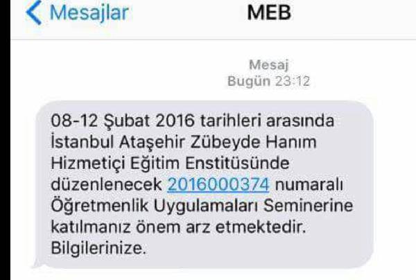 Sömestir tatilinin yarın sona ermesinden önce Şırnak'ın İdil İlçesi'nde görevli 1200 öğretmene İstanbul'da düzenlenecek eğitim seminerine katılmaları için bakanlıktan SMS yoluyla çağrısı gönderildi. Öğretmenlerin cep telefonlarından gönderilen SMS çağrısında, "08-12 Şubat 2016 tarihleri arasında İstanbul Ataşehir Zübeyde Hanım Hizmet içi eğitim enstitüsünde düzenlenecek 2016000374 numaralı öğretmenlik uygulamaları seminerine katılmanız önem arz etmektedir. Bilgilerinize" denildi.