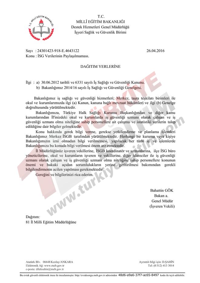 Konu hakkında gerek bilgi verme, gerekse yetkilendirme ve planlama işlemleri Bakanlığımız Merkez İSGB tarafından yürütülmektedir. Herhangi bir kurama veya kişiye Bakanlığımızın izni olmadan bilgi verilmemesi, yapılacak her türlü iş ve işlemlerde Bakanlığımıza bu konuda bilgi verilmesi önem arz etmektedir.