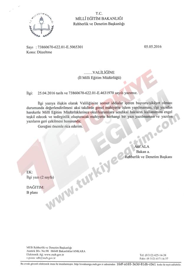 Millî Eğitim Müdürlüklerince okul/kurumlara sendikal hakların kullanımına engel teşkil edecek ve tedirginlik oluşturacak mahiyette herhangi bir yazı yazılmaması ve yazılan yazıların geri çekilmesi