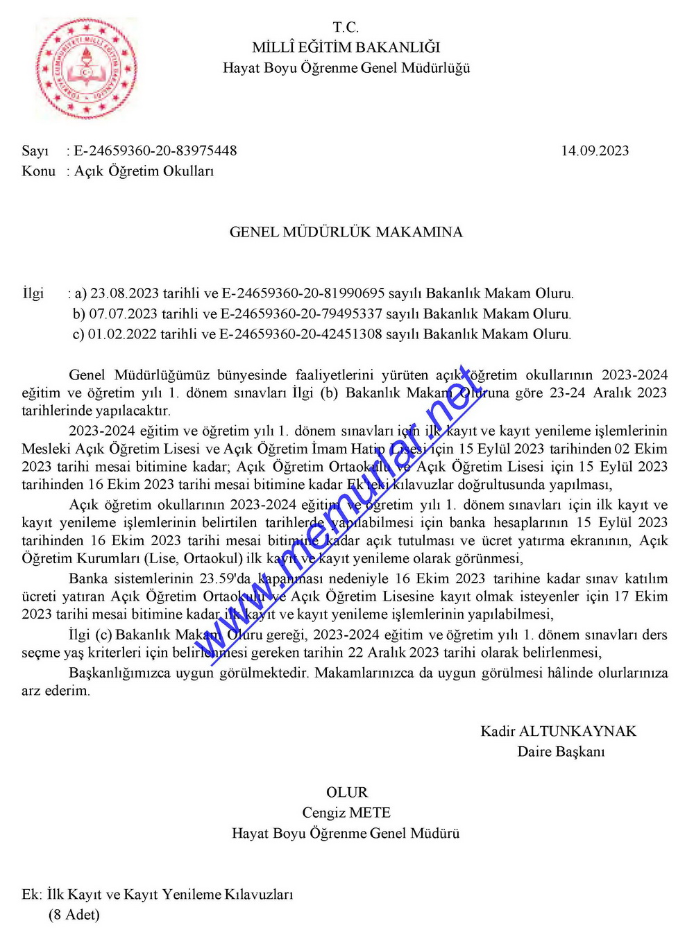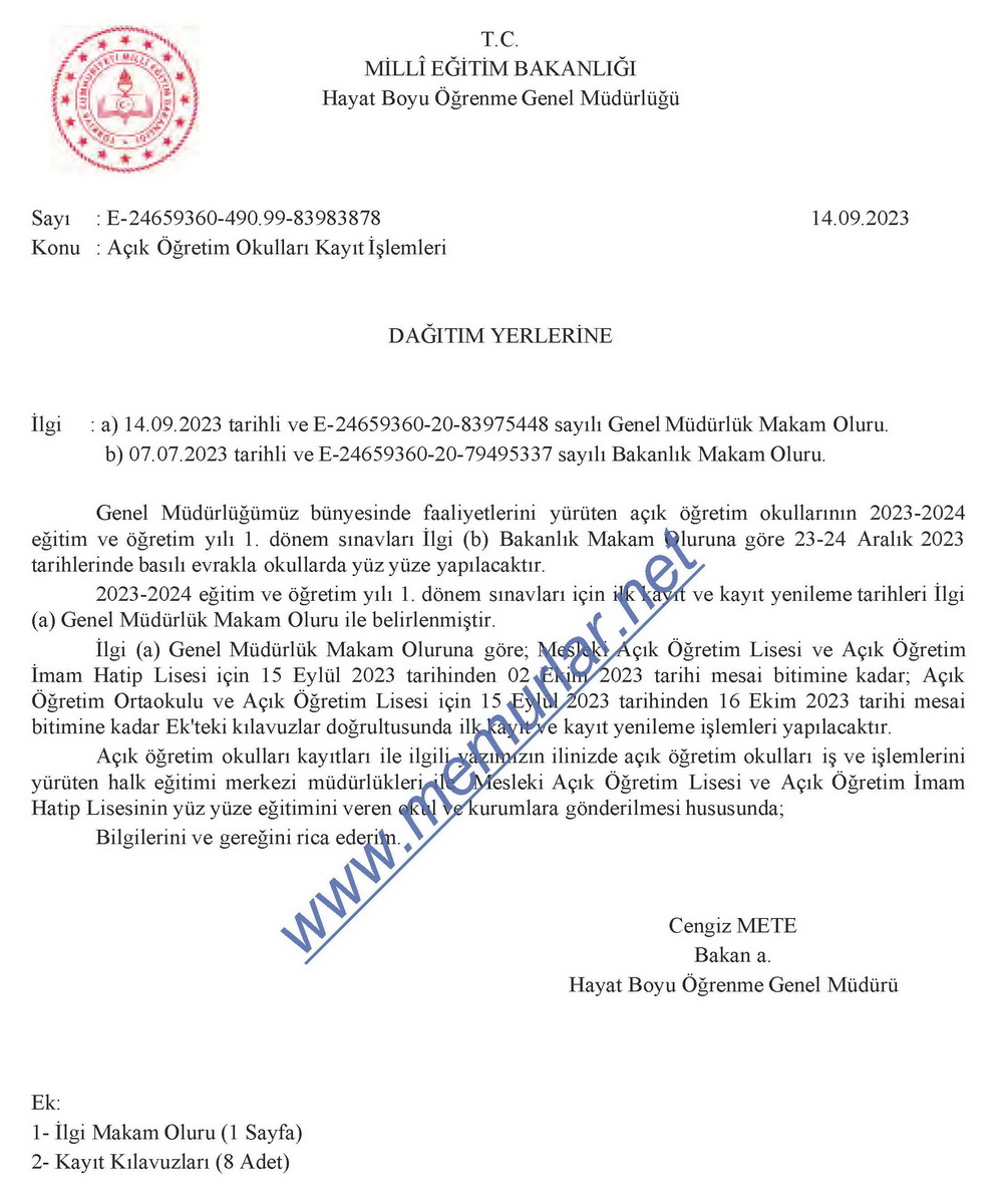 Milli Eğitim Bakanlığı, Açık öğretim okullarının 2023-2024 eğitim ve öğretim yılı 1. dönem sınavlarının, 23-24 Aralık 2023 tarihlerinde basılı evrakla okullarda yüz yüze yapılacağını ve ilk kayıt ve kayıt yenileme işlemlerinin hangi tarihlerde yapılacağın