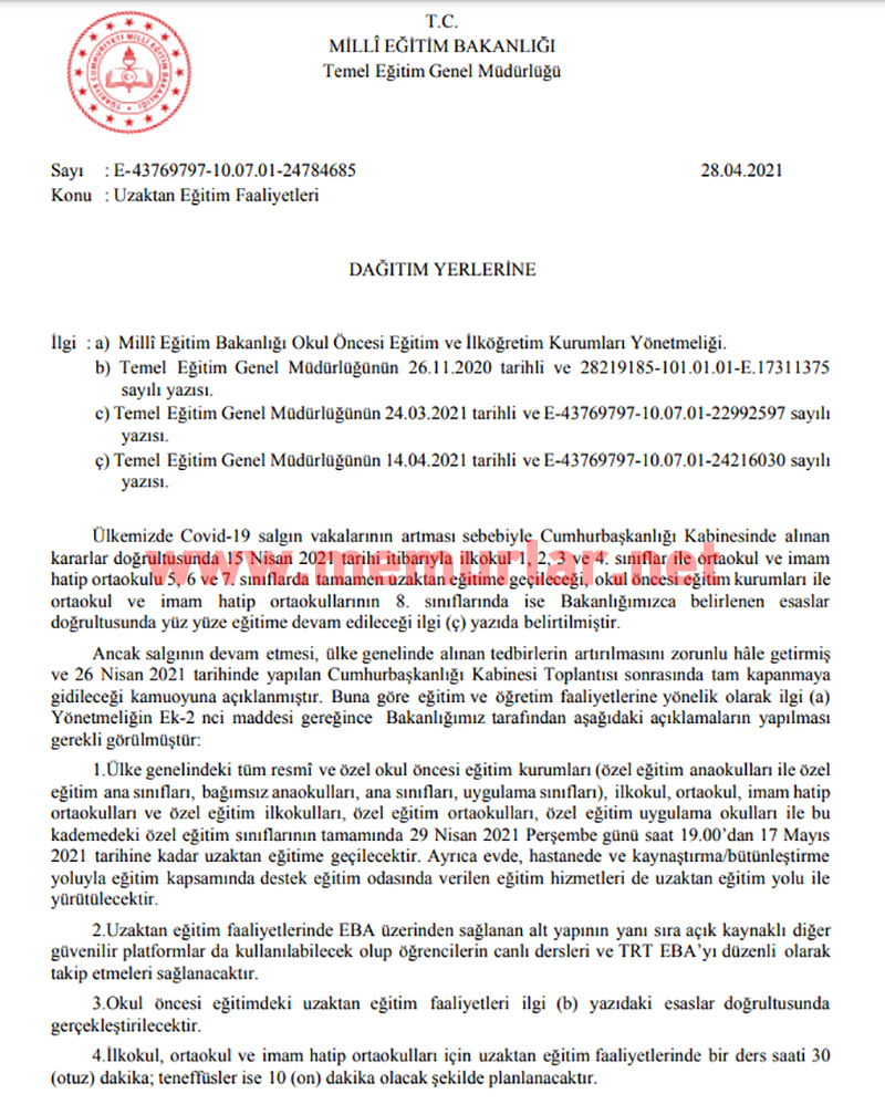 MEB Temel Eğitim Genel Müdürlüğü uzaktan eğitim faaliyetlerine dair yazıyı 28 Nisan 2021 tarihi itibariyle ilgili birimlere gönderdi.
