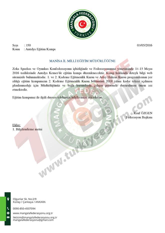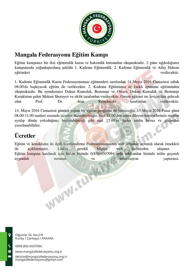 Zeka Sporları ve Oyunları Konfederasyonu işbirliğinde ve Federasyonumuz yönetiminde 14-15 Mayıs 2016 tarihlerinde Antalya Kemer'de eğitim kampı düzenlenecektir. Kamp hakkında detaylı bilgi web sitemizde bulunmaktadır. 1. ve 2. Kademe Eğitmenlik Kursu ve Aday Hakem Kursu programlarının yer aldığı eğitim kampımızın 2. Kademe Eğitmenlik Kursu bölümünü 2018 yılma kadar tekrar açılması planlanmadığı için Müdürlüğünüz ve bağlı kumullarda çalışan personele duyurulması önem aız etmektedir.