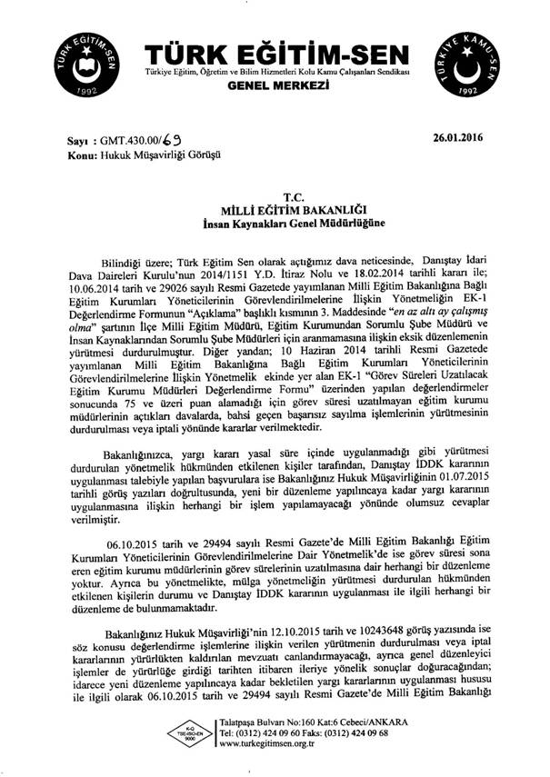 Türk Eğitim Sen olarak MEB İnsan Kaynakları Genel Müdürlüğüne gönderdiğimiz yazıda, uygulamada tereddüde düşülen hususlarda Hukuk Müşavirliğinin görüş yazıları doğrultusunda hareket edildiğini, ancak daha önceki olumsuz görüş yazılarının ivedilikle valiliklere gönderilmesine karşılık, süreç içerisinde değişen ve okul müdürlerinin lehine olan görüş yazılarının gereğinin yapılması için valiliklere gönderilmemesinin gerekçesinin anlaşılamadığını ifade ederek, okul müdürleri hakkındaki yargı kararlarının uygulanması süreciyle ilgili olarak, Hukuk Müşavirliğinin son görüş yazıları doğrultusunda işlem tesis edilmesi için valiliklere ivedilikle talimat gönderilmesi hususunda talepte bulunduk.