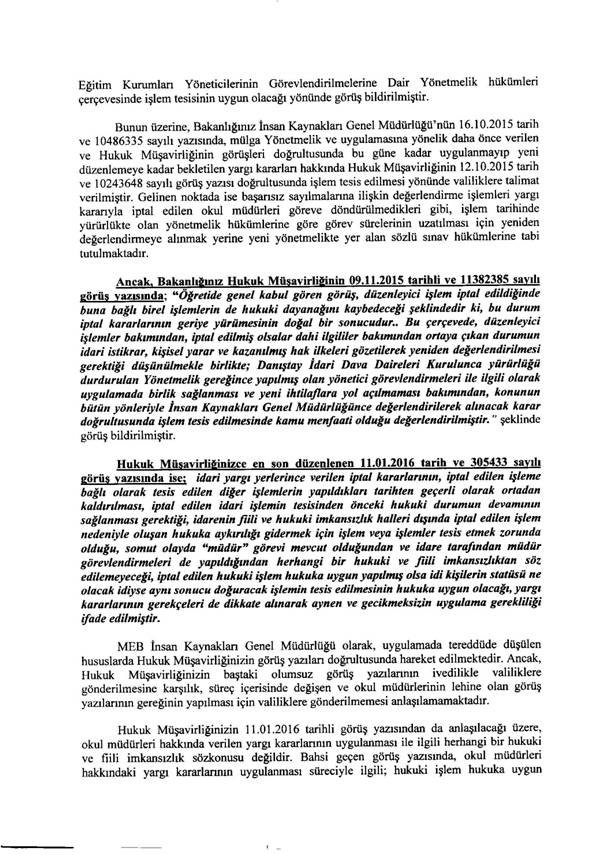 Bilindiği üzere; MEB Hukuk Müşavirliğinin daha önceki görüş yazılarının aksine son görüş yazılarında; idari yargı yerlerince verilen iptal kararlarının, iptal edilen işleme bağlı olarak tesis edilen diğer işlemlerin yapıldıkları tarihten geçerli olarak ortadan kaldırılması, iptal edilen idari işlemin tesisinden önceki hukuki durumun devamının sağlanması gerektiği, idarenin fiili ve hukuki imkansızlık halleri dışında iptal edilen işlem nedeniyle oluşan hukuka aykırılığı gidermek için işlem veya işlemler tesis etmek zorunda olduğu, somut olayda “müdür” görevi mevcut olduğundan ve idare tarafından müdür görevlendirmeleri de yapıldığından herhangi bir hukuki ve fiili imkansızlıktan söz edilemeyeceği, iptal edilen hukuki işlem hukuka uygun yapılmış olsa idi kişilerin statüsü ne olacak idiyse aynı sonucu doğuracak işlemin tesis edilmesinin hukuka uygun olacağı, yargı kararlarının gerekçeleri de dikkate alınarak aynen ve gecikmeksizin uygulama gerekliliği ifade edilmiştir.