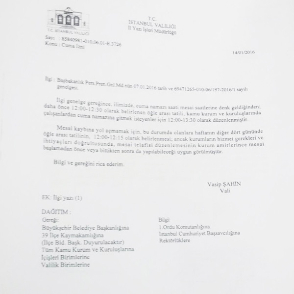 İstanbul Valiliği gönderdiği yazıda şunları dile getirdi: "Cuma namazı saati mesai saatlerine denk geldiğinden daha önce 12.00 -12.30 olarak belirlenen öğle arası tatili, kamu kurumlarında çalışanların cuma namazına gitmek isteyenler için 12.00-13-30 olarak düzenlenmiştir.