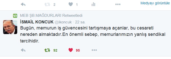 Sayın İsmail KOCUK'un 20 Ocak 2016 tarihinde twitter üzerinden yaptığı paylaşım özellikle Memur-Sen üyelerinin özeleştiri yapmalarını ve üyesi oldukları sendikaları sorgulamalarına sebep olmuştur.