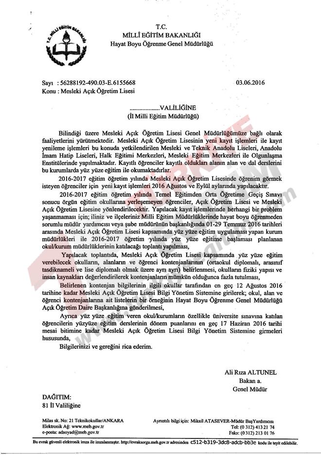 2016-2017 eğitim öğretim yılında Temel Eğitimden Orta Öğretime Geçiş Sınavı sonucu örgün eğitim okullarına yerleşemeyen öğrenciler, Açık Öğretim Lisesi ve Mesleki Açık Öğretim Lisesine yönlendirilecektir. Yapılacak kayıt işlemlerinde herhangi bir problem yaşanmaması için; iliniz ve ilçeleriniz Milli Eğitim Müdürlüklerinde hayat boyu öğrenmeden sorumlu müdür yardımcısı veya şube müdürünün başkanlığında 01-29 Temmüz 2016 tarihleri arasında Mesleki Açık Öğretim Lisesi kapsamında yüz yüze eğitim uygulaması yapan kurum müdürlükleri ile 2016-2017 öğretim 'yılında yüz yüze eğitime başlaması planlanan okul/kurum müdürlüklerinin katılacağı toplantı yapılması,