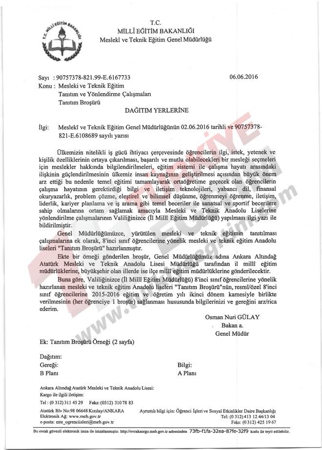 Buna göre, Valiliğinizce (İl Millî Eğitim Müdürlüğü) 8'inci sınıf öğrencilerine yönelik hazırlanan mesleki ve teknik eğitim Anadolu liseleri "Tanıtım Broşürü"nün, resmî/özel 8'inci sınıf öğrencilerine 2015-2016 eğitim ve öğretim yılı ikinci dönem karnesiyle birlikte verilmesinin (her öğrenciye 1 broşür) sağlanması hususunda bilgilerinizi ve gereğini arz/rica ederim.
